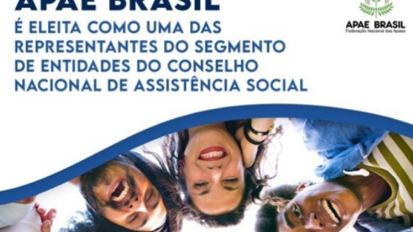 #ParaTodosVerem#PraCegoVer card com fundo branco. Na parte superior está escrito, em azul: "Apae Brasil é eleita como uma das representantes do segmento de entidades do Conselho Nacional de Assistência Social". No canto superior direito está a logo da Apae Brasil. Abaixo, uma imagem de várias pessoas sorridentes em círculo, olhando em direção à foto.