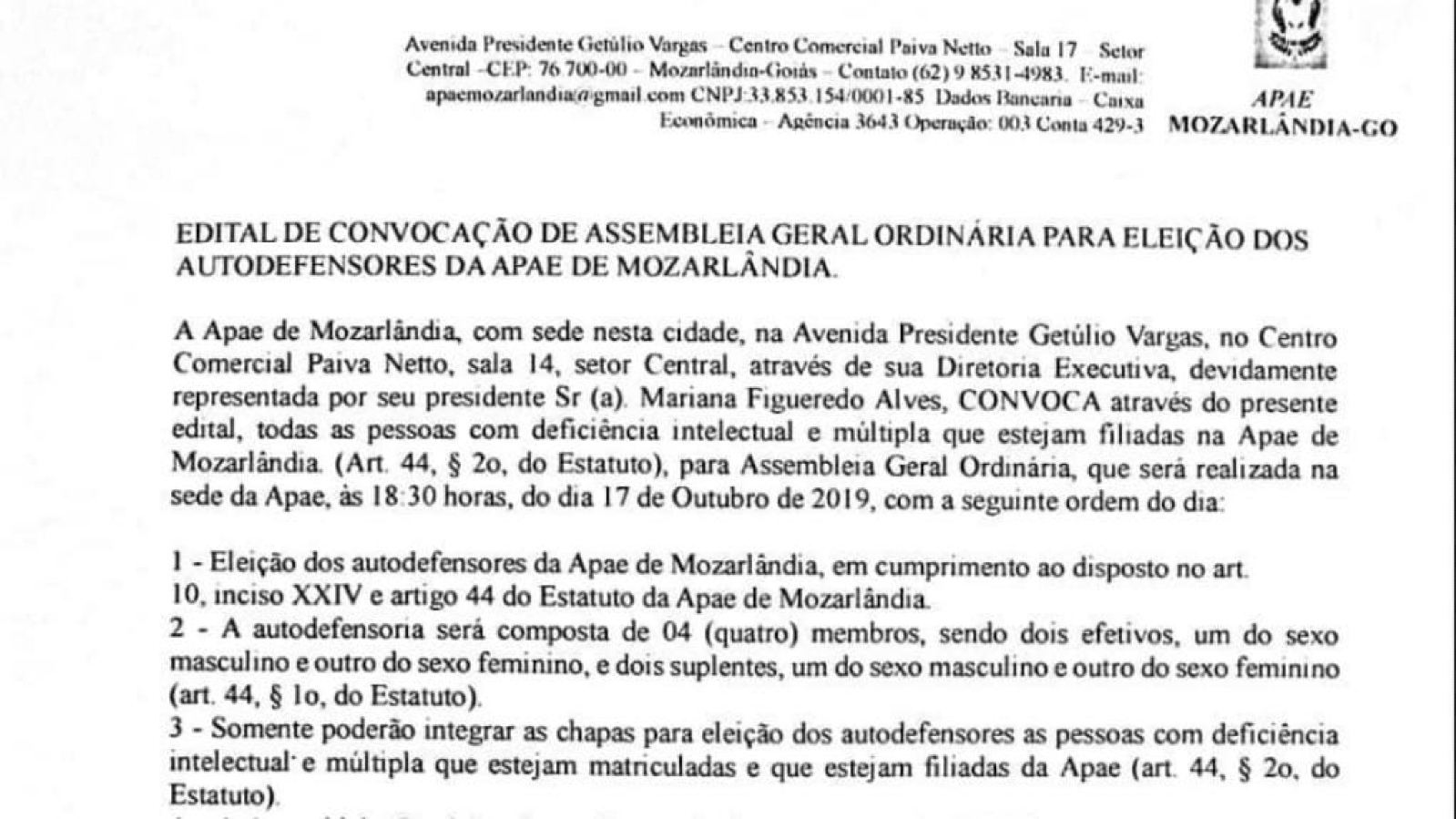 EDITAL DE CONVOCAÇÃO DE ASSEMBLEIA GERAL ORDINÁRIA PARA ELEIÇÃO DOS AUTODEFENSORES DA APAE DE MOZARLÂNDIA.