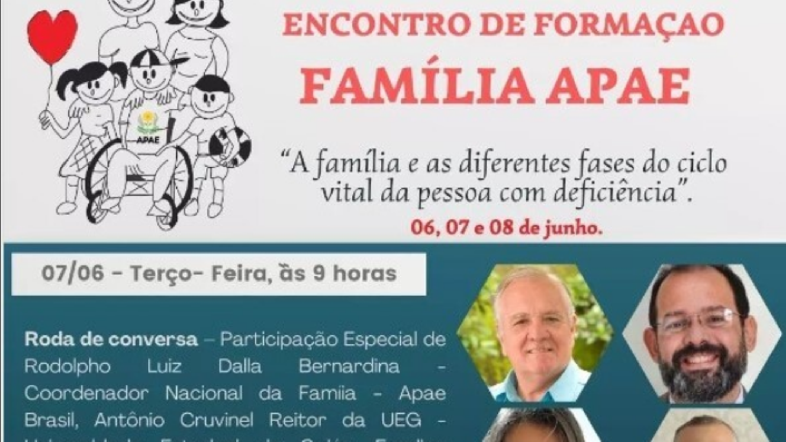 A Feapaes GO promoverá, nos dias 06, 07 e 08 de junho, o Encontro de Formação - Família Apae, evento que abordará a temática: "A família e as diferentes fases do ciclo vital da pessoa com deficiência"