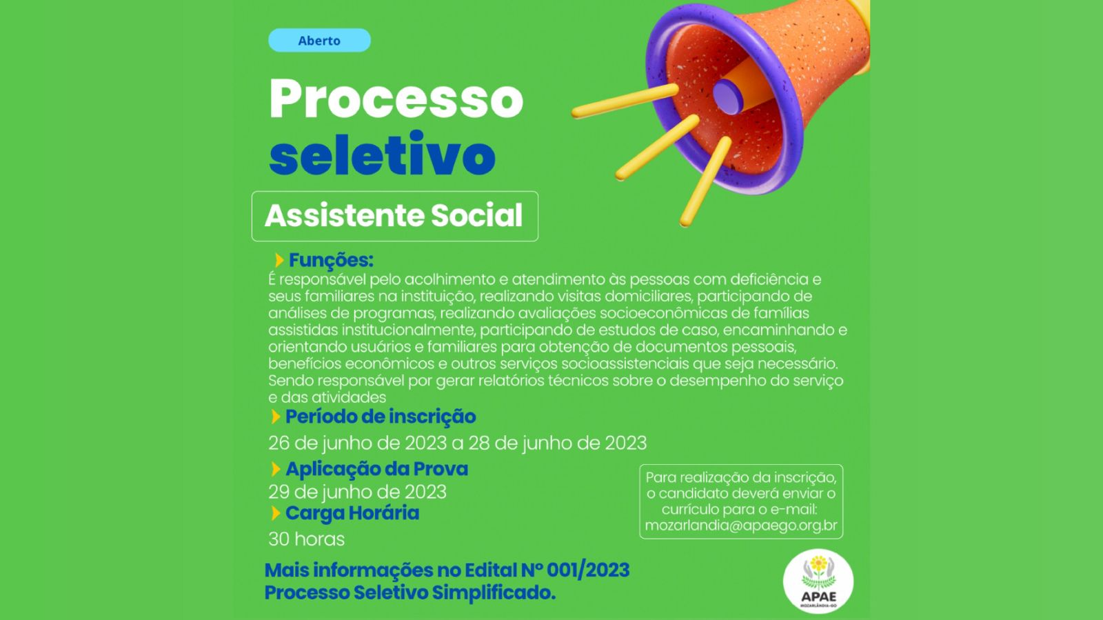 A APAE Mozarlândia informa que está com processo seletivo em aberto para contratação de Assistente Social, para maiores informações os interessados deverão consultar o edital 01/2023: Processo Seletivo Simplificado 26 de junho de 2023.
