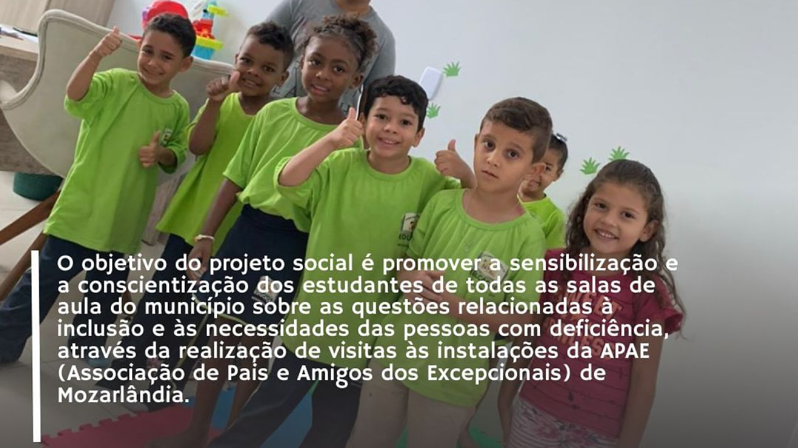 O objetivo do projeto social é promover a sensibilização e a conscientização dos estudantes de todas as salas de aula do município sobre as questões relacionadas à inclusão e às necessidades das pessoas com deficiência, através da realização de visitas às instalações da APAE (Associação de Pais e Amigos dos Excepcionais) de Mozarlândia.