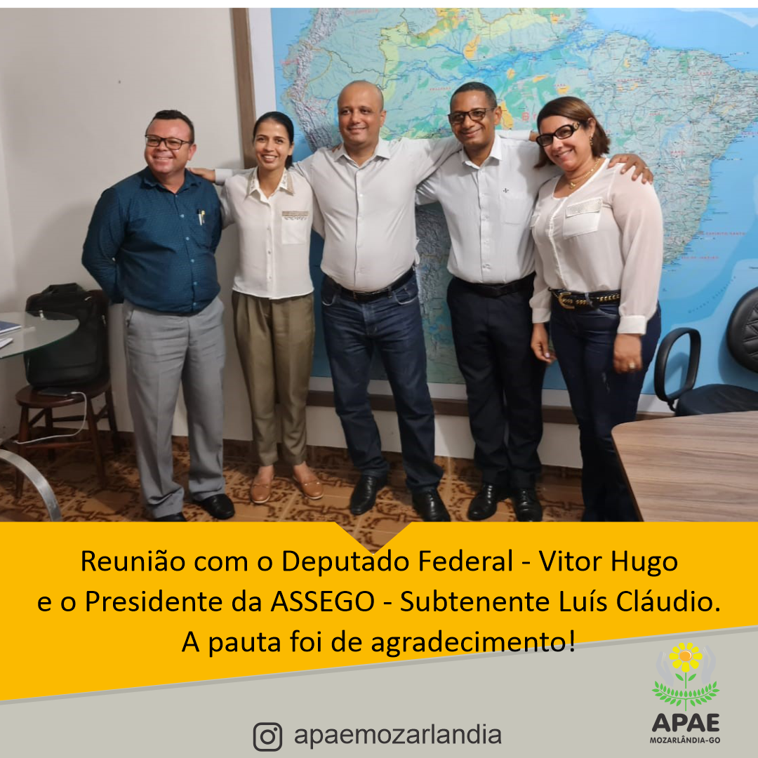 Reunião com o Deputado Federal - Vitor Hugo e o Presidente da ASSEGO - Subtenente Luís Cláudio. A pauta foi de agradecimento pela a emenda de 200 mil, a qual já foi paga para a Prefeitura de Mozarlândia e será repassada para a nossa APAE no início do ano que vem, e será aplicada na ampliação da equipe multiprofissional da nossa APAE, também solicitamos ao Deputado, uma emenda de um milhão para construir a clínica da nossa APAE.