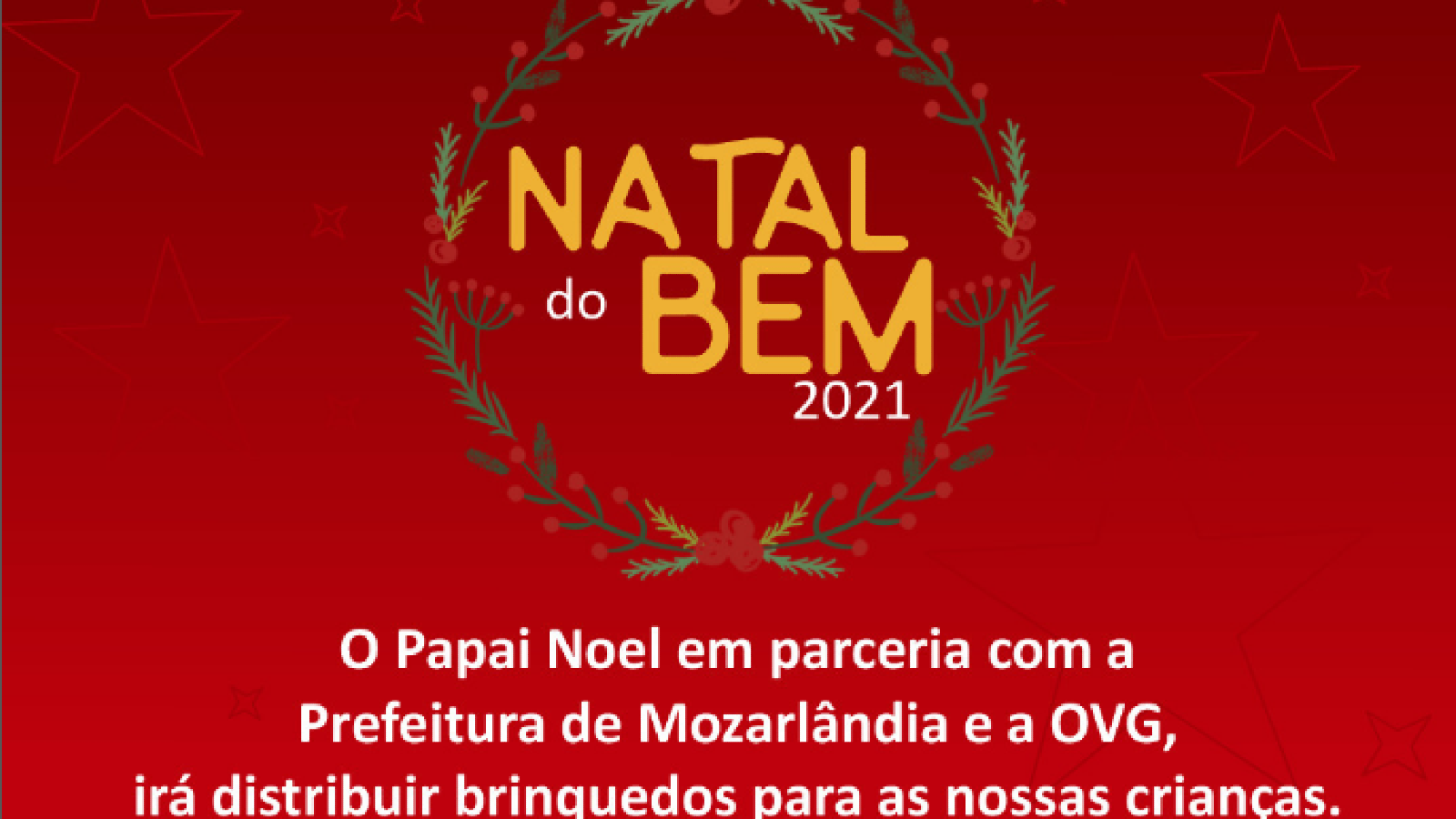 O Papai Noel em parceria com a prefeitura de mozarlandia e a ovg, vai distribuir os brinquedos para as nossas crianças.